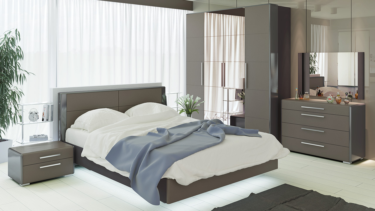 Комплект мебели для спальни «Наоми Трия К1» понравится тем, кто предпочитает строгие и минималистичные решения в оформлении интерьера. Мебель выполнена в прямых линиях и благородных грифельных оттенках, что подчеркнет изысканный и эстетичный вкус хозяина квартиры, а функциональные элементы в составе комплекта позволяют создать удобную обстановку.Мебель изготавливается из ЛДСП и МДФ. Фасадные элементы покрыты пленкой ПВХ. Ручки — металл.