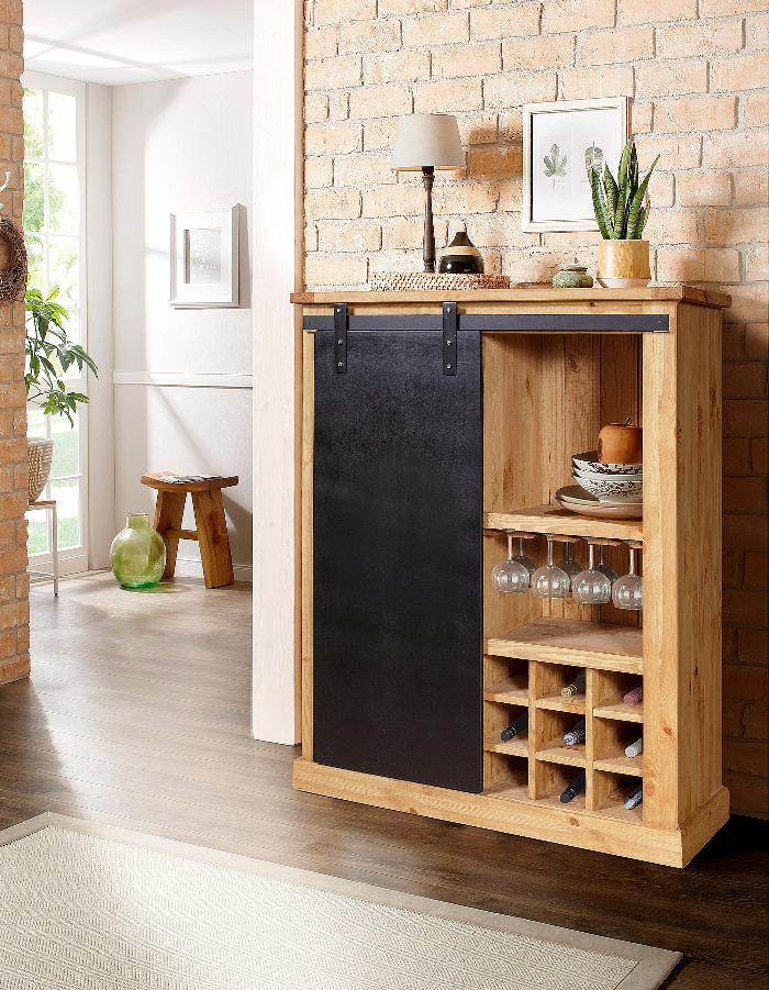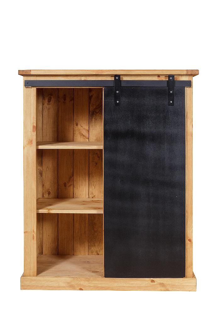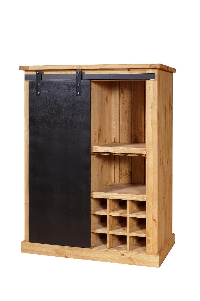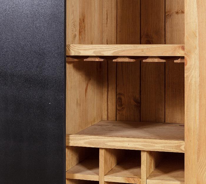 Шкаф ROLLER выполнен из массива сосны. Штанга над дверкой металлическая. Движение дверок по штанге осуществляется на роликах. Дверки установлены на механизме "Купе", ящики на деревянных полозьях. Темные дверки - нанесён чёрный, матовый лак. Задние стенки и донышки ящичков - наборная вагонка, сосна.