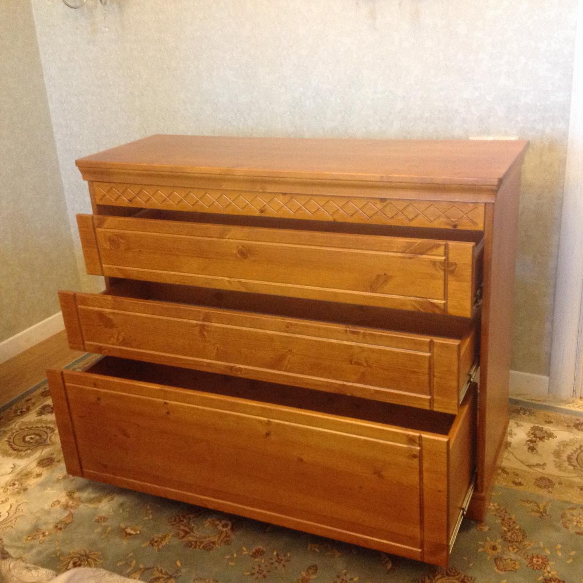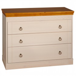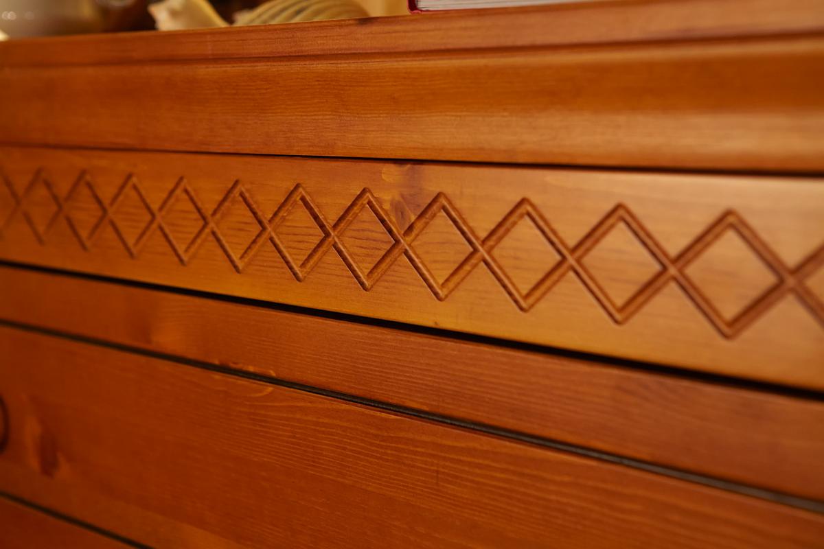 Большой вместительный комод из натурального дерева — отличный элемент меблировки для классического интерьера спальни или гостиной. Модель имеет три выдвижных ящика: два верхних — малые, нижний — большой. Верхняя царга декорирована ненавязчивой резьбой. Нотку шарма комоду придают маленькие металлические колечки на фасадах. Широкая столешница позволит расставить комнатные растения, любимые фотографии. Комод изготавливается из массива сосны и покрыт тонировкой на водной основе. Мебель из натурального дерева отличается долговечностью, прочностью и экологичностью.
