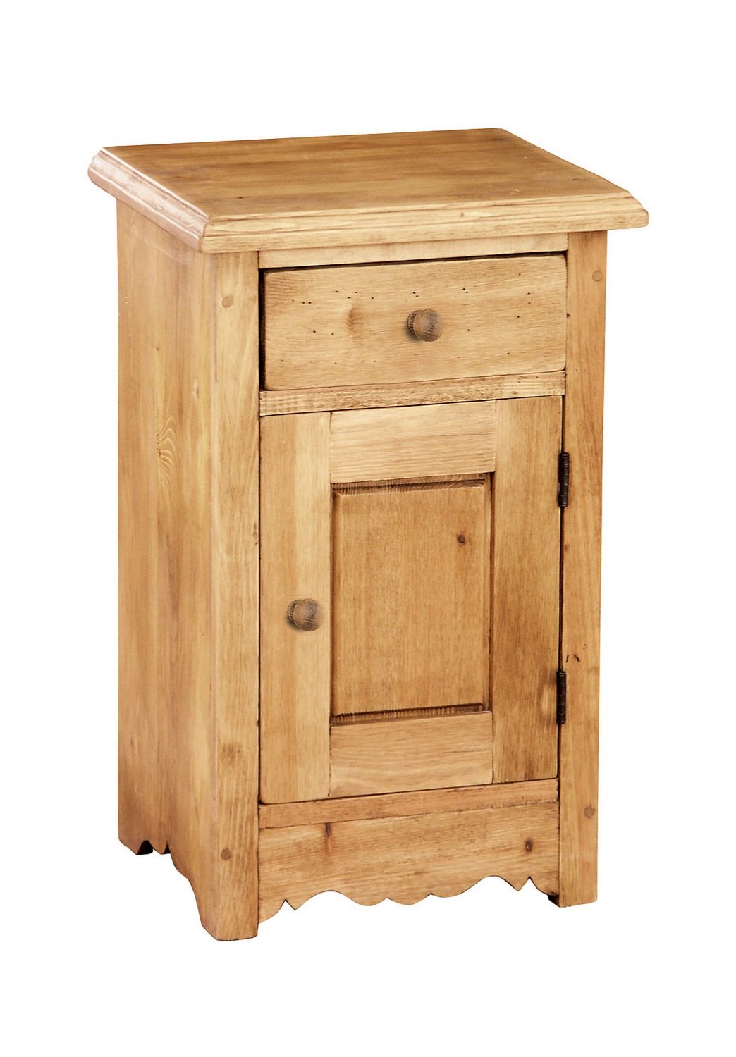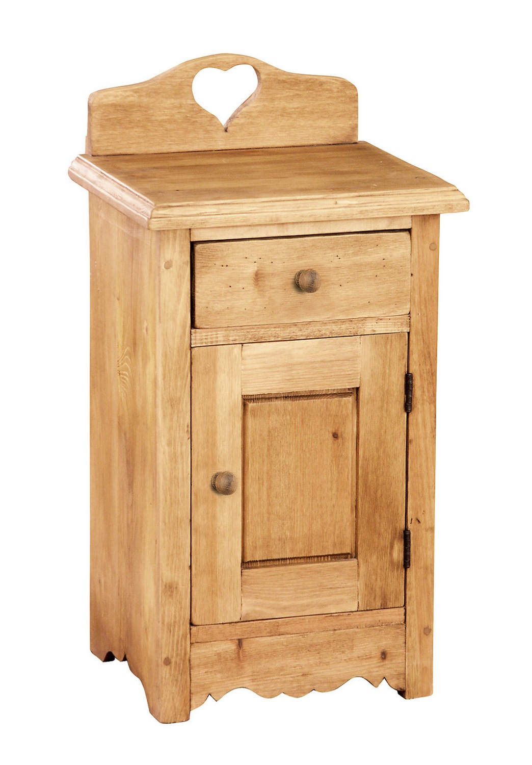Маленькая прикроватная тумбочка станет уютным и полезным дополнением в спальне. Тумбочка имеет съемную ограничительную планку с вырезом в виде сердечка. Нижний фартук тумбочки декорирован изящной резьбой. Модель оснащена шкафчиком и выдвижным ящичком для разных мелочей. Тумбочка выполняется полностью из массива сосны с эффектом старения, поверхность изделия не лакированная, она обработана защитным воском. Обратите внимание! Часто поверхность дерева искусственно состаривается, наносятся потертости, небольшие сколы, а также древоточены. Это не является браком, это делается специально в декоративных целях.