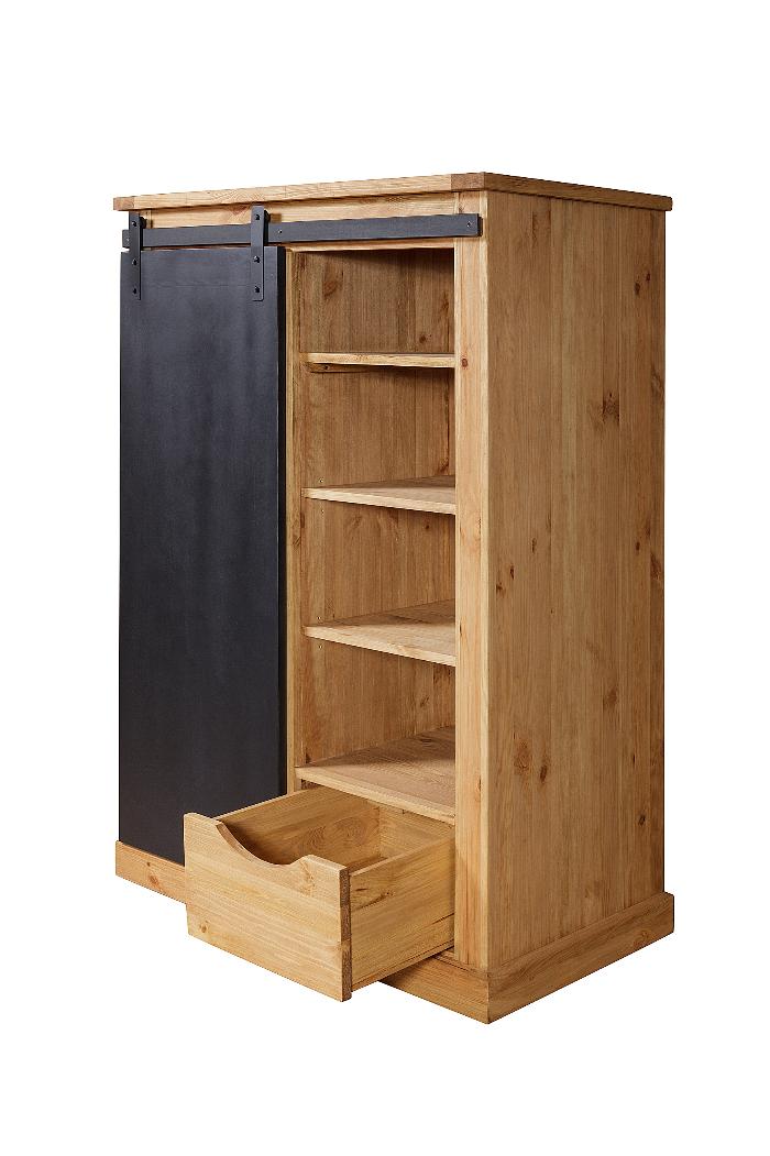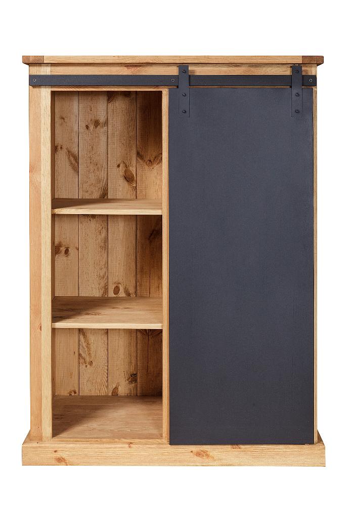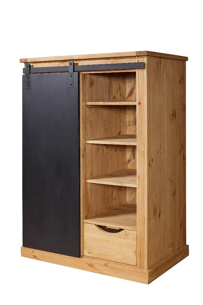 Шкаф ROLLER выполнен из массива сосны. Штанга над дверкой металлическая. Движение дверок по штанге осуществляется на роликах. Дверки установлены на механизме "Купе", ящики на деревянных полозьях. Темные дверки - нанесён чёрный, матовый лак. Задние стенки и донышки ящичков - наборная вагонка, сосна.