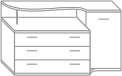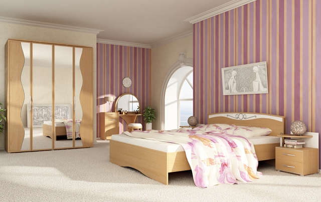 «Каприз»- модульная серия мебели для спальни. Серия «Каприз» изготовлена из материала ЛДСП, спинка кровати отделана накладкой из МДФ и вставкой белого цвета с металлическим, серебристым элементом декора. Спальня «Каприз» имеет плавный, классический дизайн в цвете «бук Бавария». Кровать оснащена решеткой с деревянными латами. Модульная мебель «Каприз» состоит из множества удобных, функциональных модулей: двуспальной кровати, шкафов-купе с зеркалами, прикроватных тумб, туалетного столика и комода.